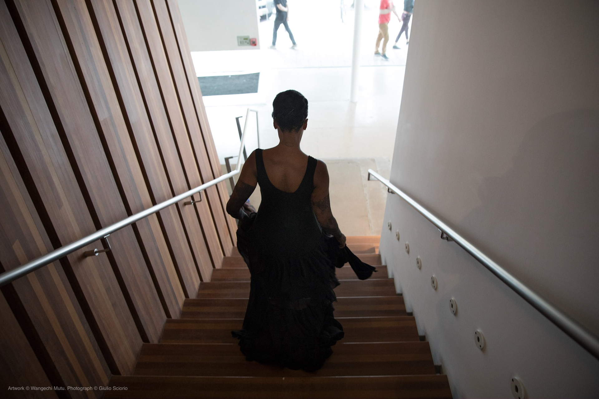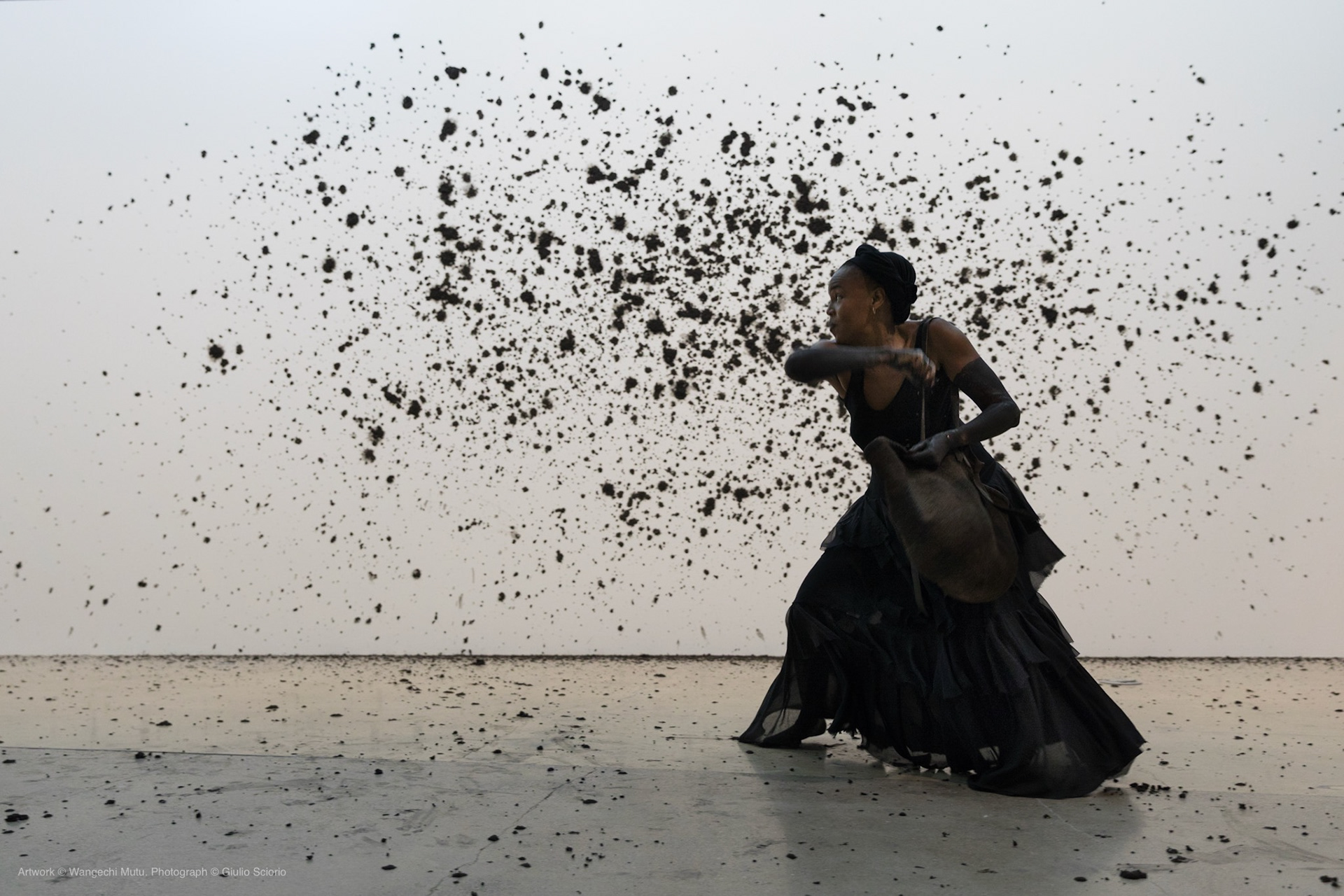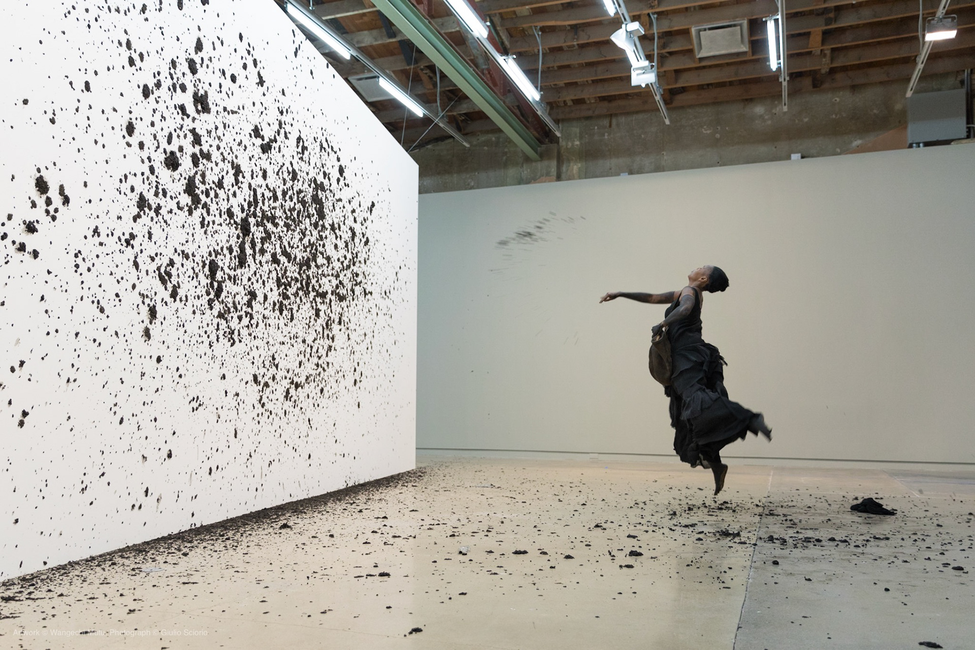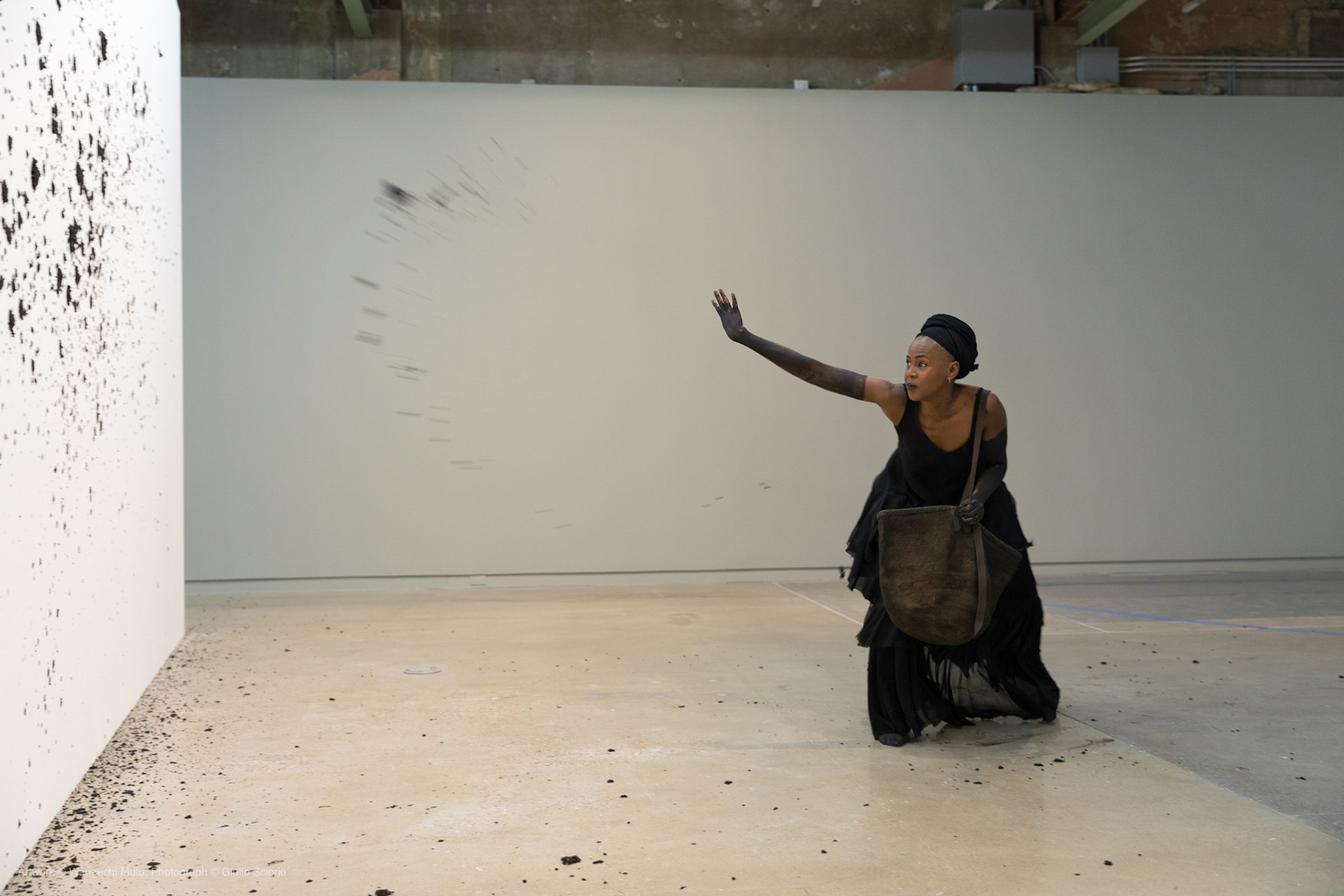 Wangechi Mutu, Throw, 2017 (2016). Site-specific action painting and performance at The Contemporary Austin, Austin, Texas. Dimensions variable. Performance view, September 19 [or 20], 2017. © Wangechi Mutu. Courtesy the artist and Gladstone Gallery, New York and Brussels. Images courtesy The Contemporary Austin. Photographs © Giulio Sciorio.