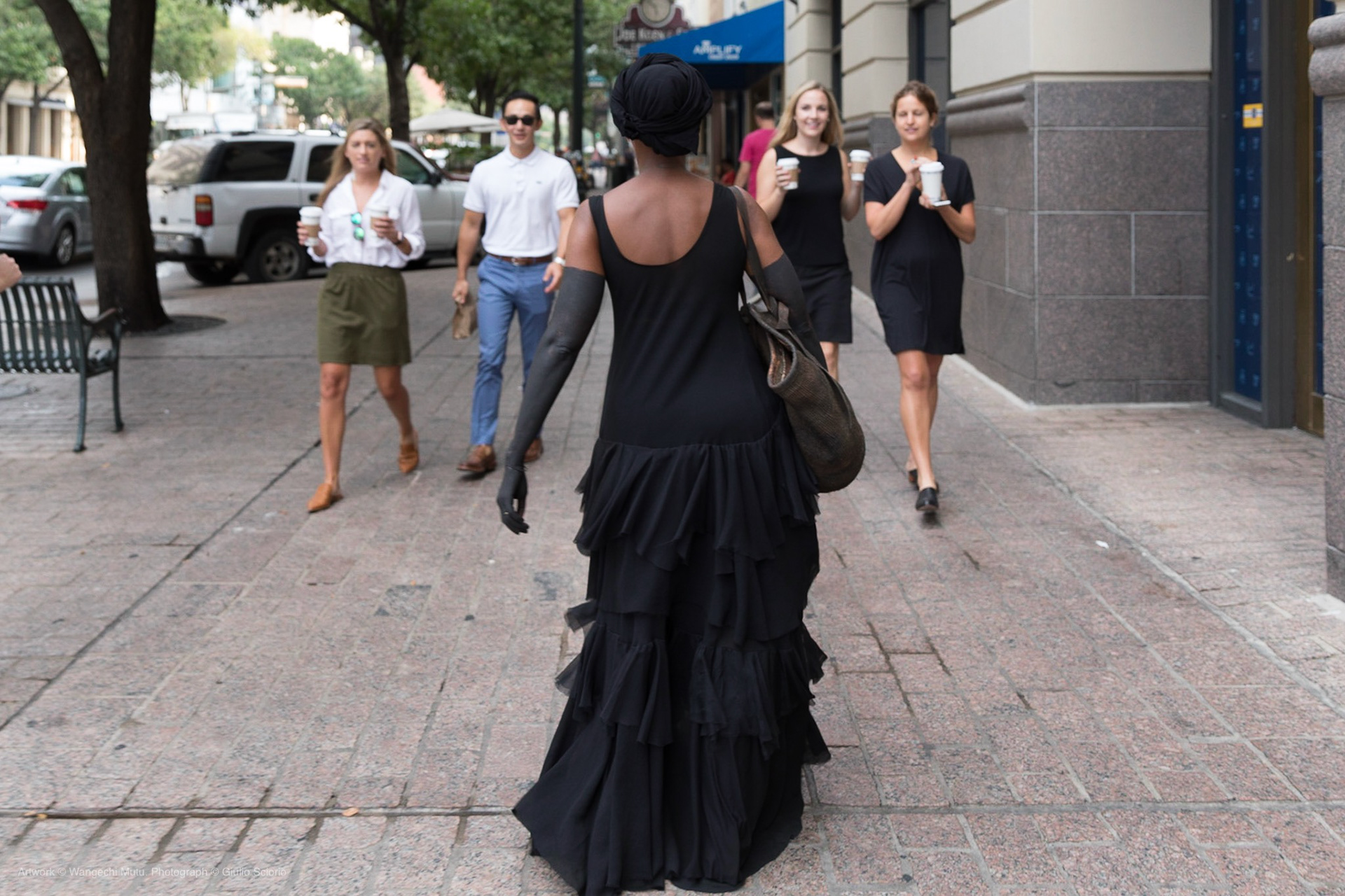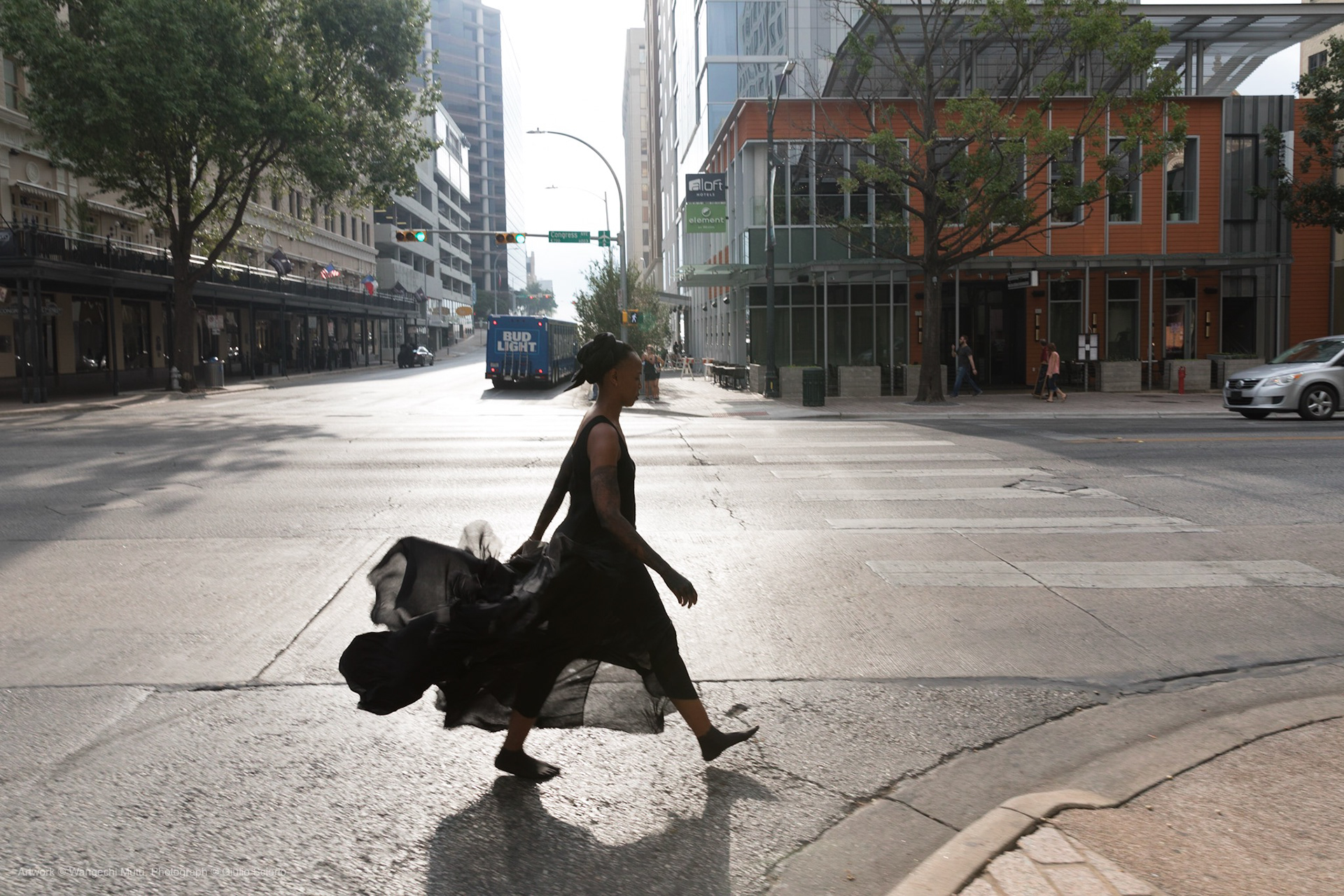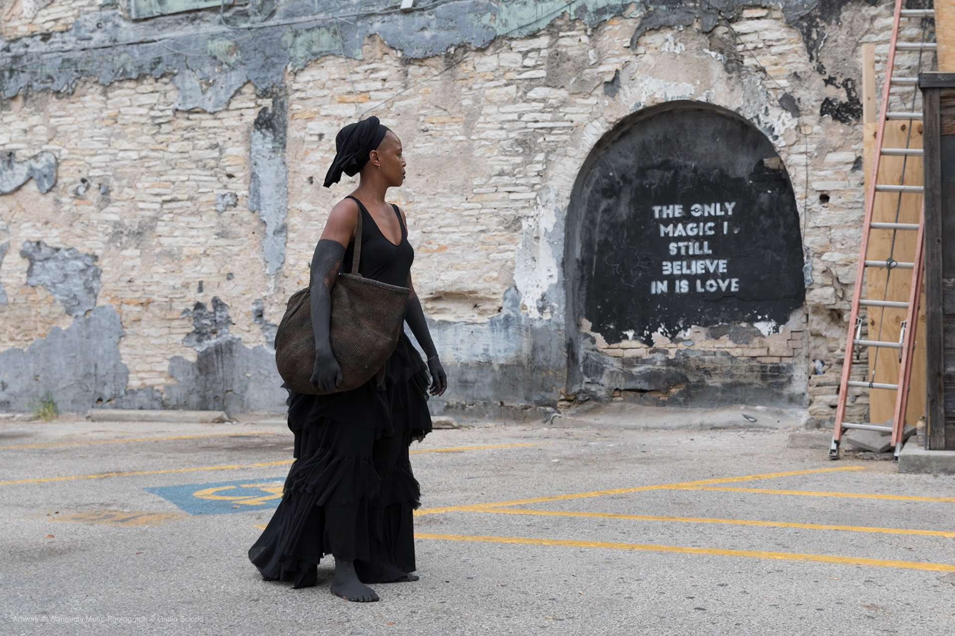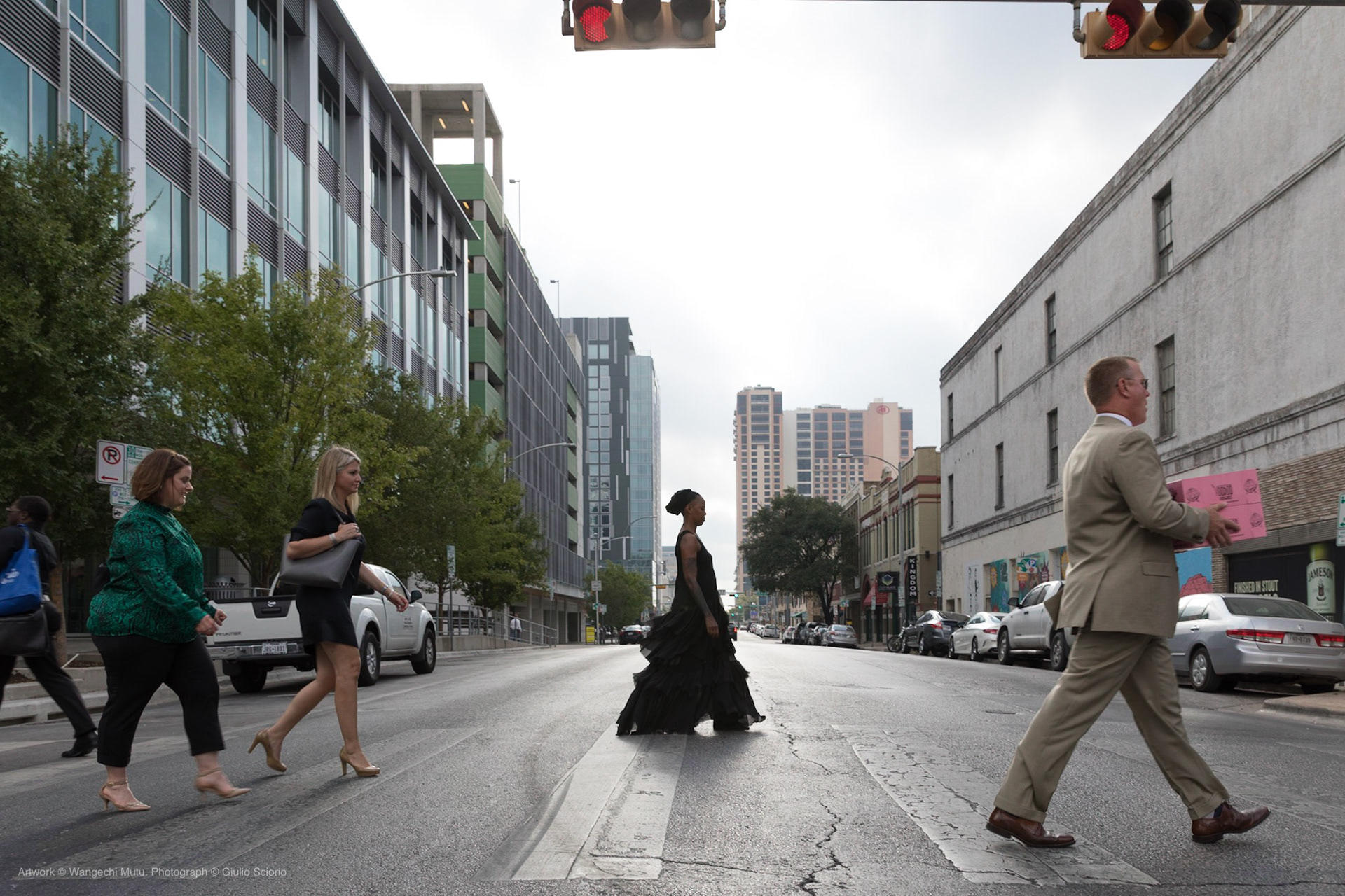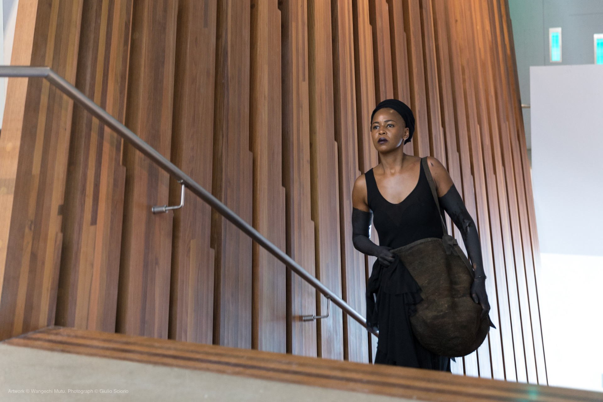 Wangechi Mutu, Throw, 2017 (2016). Site-specific action painting and performance at The Contemporary Austin, Austin, Texas. Dimensions variable. Performance view, September 19 [or 20], 2017. © Wangechi Mutu. Courtesy the artist and Gladstone Gallery, New York and Brussels. Images courtesy The Contemporary Austin. Photographs © Giulio Sciorio.